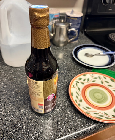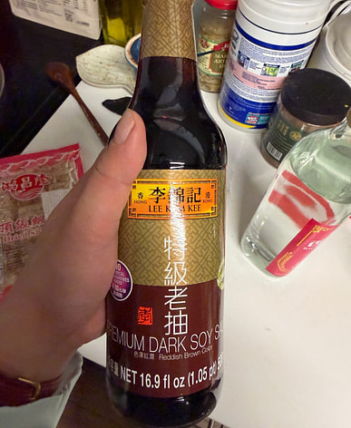 I bought all my seasonings at the new house in one place. I've always used Lee Kum Kee dark soy sauce, and I'll repackage it when my seasoning bottles arrive.