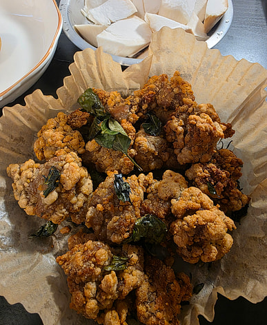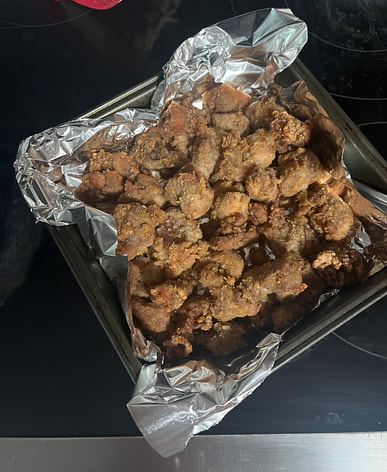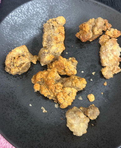 It's quite delicious, not too salty, with a subtle spiciness. I used an air fryer at 370 degrees Celsius for 18 minutes. Because it was frozen, it went in as a single lump, and the outside was very crispy, while the center was slightly moist. If you're particular, you can break it up in the middle. It would be even better if the product came with plum powder.