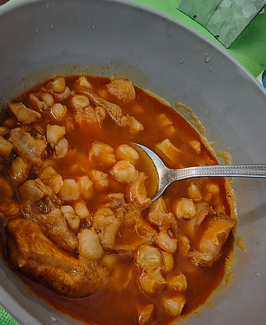 The main ingredients are beef tripe, hominy, red chili peppers, garlic, onion, oregano, and salt.