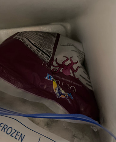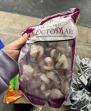 The octopus is delicious. However, it's a shame that it's frozen with the water, so I have to thaw it all. I made some stir-fried octopus and froze the rest.
