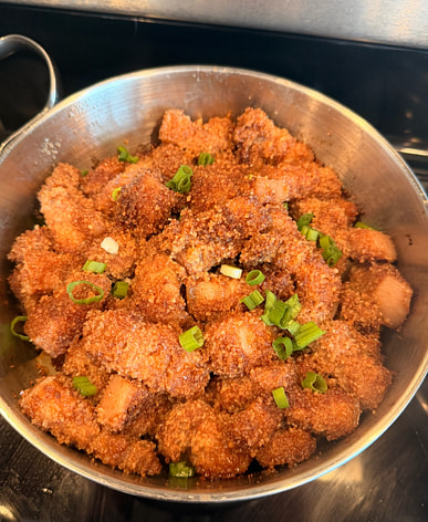 Steamed pork with rice flour as a base, topped with hot and sour shredded potatoes