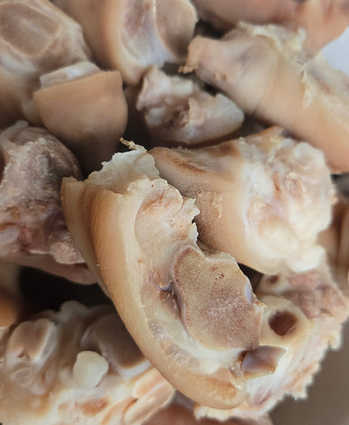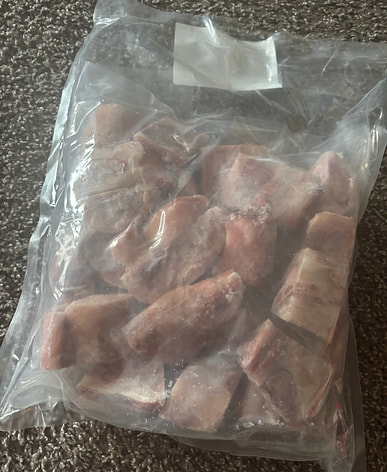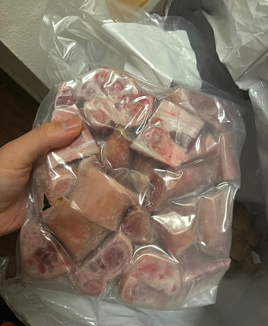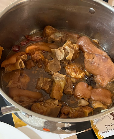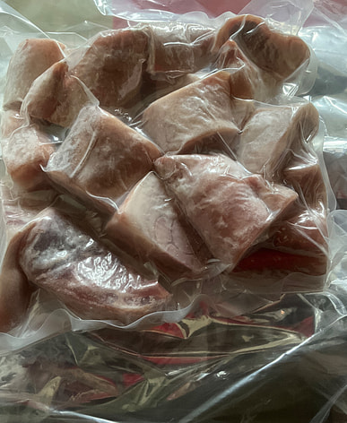 4 pounds of frozen pork forelegs and trotters, cut into pieces. Looks pretty good; ready to make soybean and pork trotter soup.