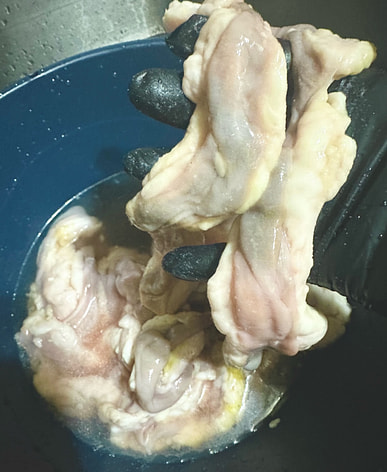 The intestines were full of fat and not fresh, they were dark and discolored. I didn't dare eat them.