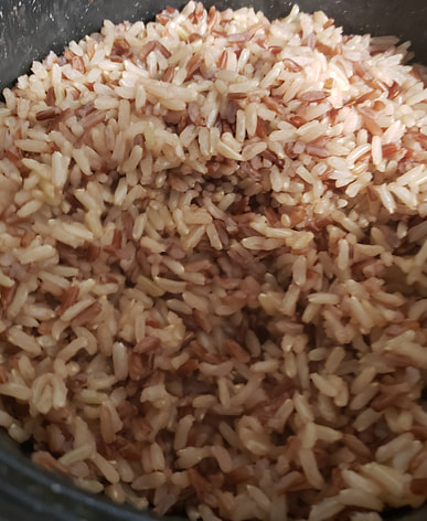 Se cocinan dos tazas y media de arroz y tres tazas de agua a la vez en una olla a presión hasta que quede suave.