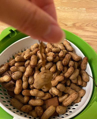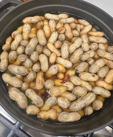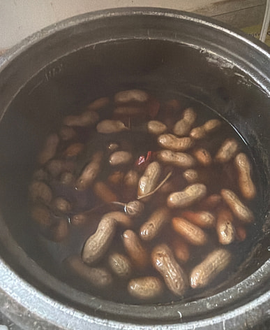 Cacahuetes cocidos: canela, anís estrellado, un trocito de canela, cebollín, jengibre y ajo. ¡Súper adictivo!