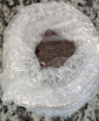Frasco de vidrio cuidadosamente embalado con plástico de burbujas.