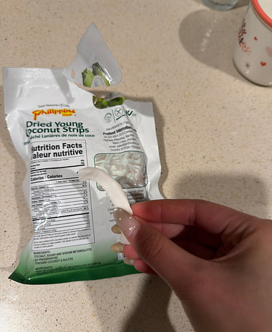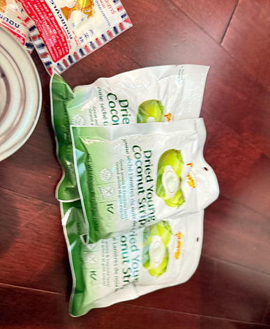 Está bastante rico. Pensé que eran chips de coco, pero en realidad es más blando, como fruta deshidratada.