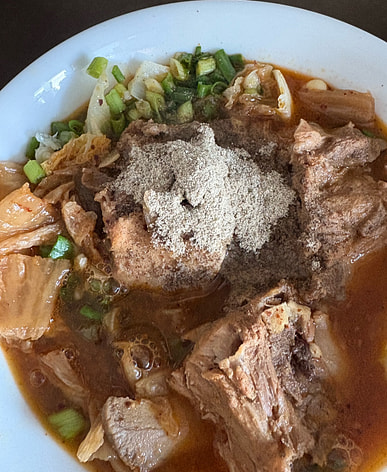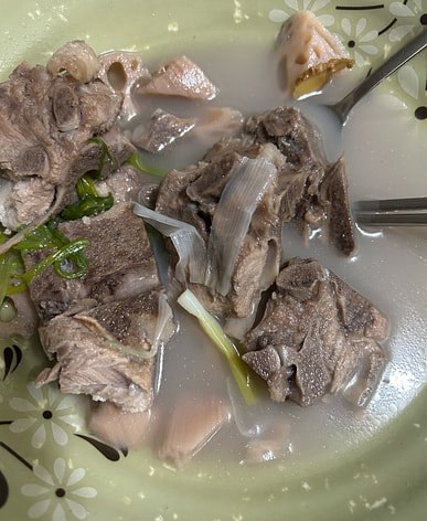 Huesos de cuello y verduras y kimchi, delicioso.