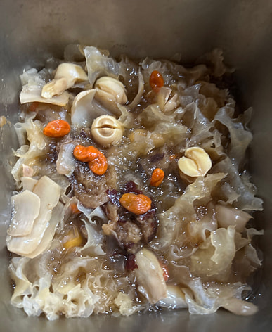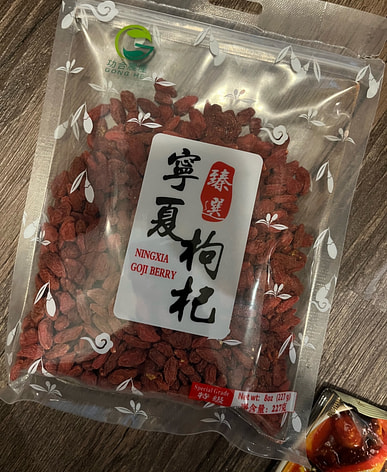 ¡Bayas de goji con hongo blanco! Bulbos de lirio, semillas de loto y dátiles rojos guisados en sopa con un poco de azúcar granulada. También me gusta hacer té con semillas de casia, que son buenas para la vista. Mi esposo hace jugo de verduras y zanahoria, y añadir bayas de goji es una ventaja.