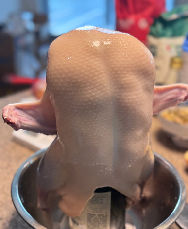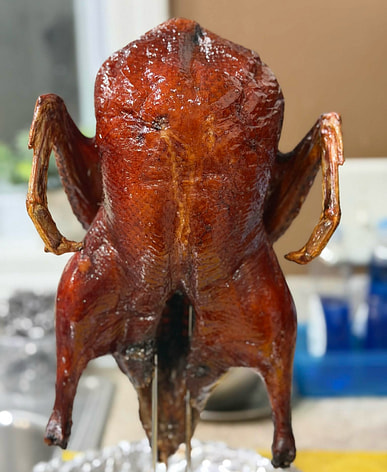 La piel de este pato estaba un poco rasgada hoy, por lo que el color no será muy uniforme cuando se convierta en pato asado.