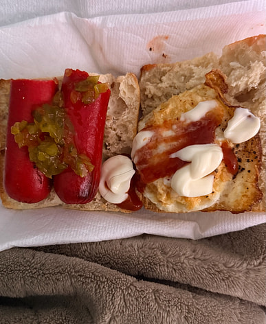 Un hot dog realmente gigante, mi nieto está emocionado de cocinarlo.